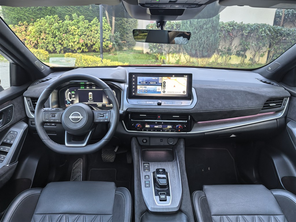 Qashqai e-POWER, dış tasarımında modern Japon çizgilerini güçlü bir şekilde taşıyor. Keskin far tasarımı, V-motion ızgara ve aerodinamik gövde hatları araca hem sportif hem de sofistike bir hava katıyor. İç mekâna geçtiğinizde ise kalite hissi hemen fark ediliyor. Dokulu yüzeyler, yumuşak plastik kullanımı ve ergonomik koltuk yapısı uzun yolculuklarda bile konfor sunuyor. Arka koltuk diz mesafesi oldukça geniş, bagaj hacmi de sınıf ortalamasının üzerinde.