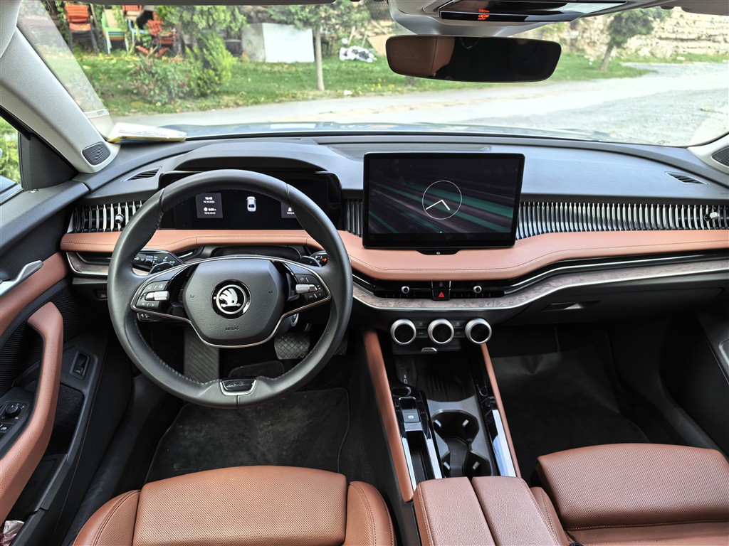 Kapıyı açtığınız anda L&K logosu sizi karşılıyor. İçeride kullanılan Nappa deri, gerçek alüminyum ve ahşap detaylarla birleşince adeta bir “Avrupa salonu” atmosferi oluşturuyor. Koltuklar ısıtmalı, soğutmalı ve masaj fonksiyonlu. Özellikle sürücü koltuğundaki “Ergo Comfort” yapısı uzun yolda fark yaratıyor. Arkada oturanlar da benzer bir lüks deneyimi yaşıyor; diz mesafesi o kadar geniş ki, neredeyse bir Superb değil, bir Superb Lounge!