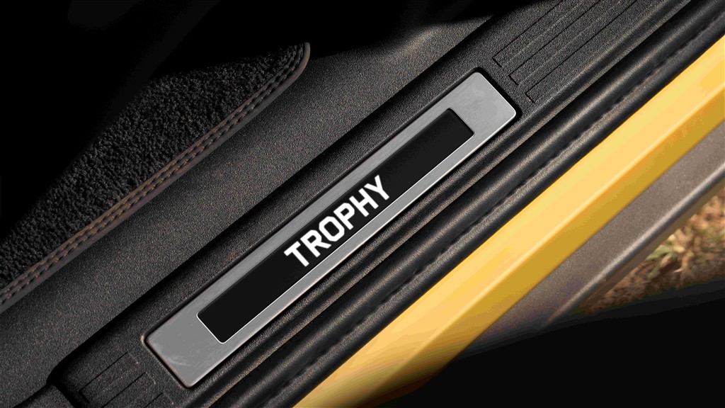Dayanıklı All-Terrain lastikler, parlak siyah 20 inç alaşım jantlar, koyu renk koruma plakaları ve özel Trophy çıkartmaları ile donatılan Trophy Edition, iç mekanda yer alan Trophy yazılı aydınlatmalı kapı eşikleri ve Ebony Windsor deri koltukları ile de diğer Defender modellerinden ayrışıyor.