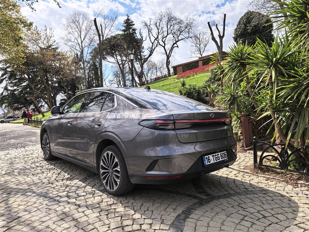 T10F’nin tasarımında markanın karakteristik ön yüzü korunmuş. İnce LED farlar ve ortadaki aydınlatmalı logo otomobile teknolojik bir ifade kazandırıyor. Arka tarafta ise coupe benzeri eğimli tavan çizgisi ve boydan boya uzanan LED stop grubu dikkat çekiyor. Bu tasarım sadece estetik değil, aerodinamik verimlilik için de önemli. Model; Fastback coupe tarzı arka tasarım, tam boy LED arka aydınlatma, aerodinamik gövde formu ve geniş cam yüzeyler ve modern jant tasarımlarıyla ön plana çıkıyor