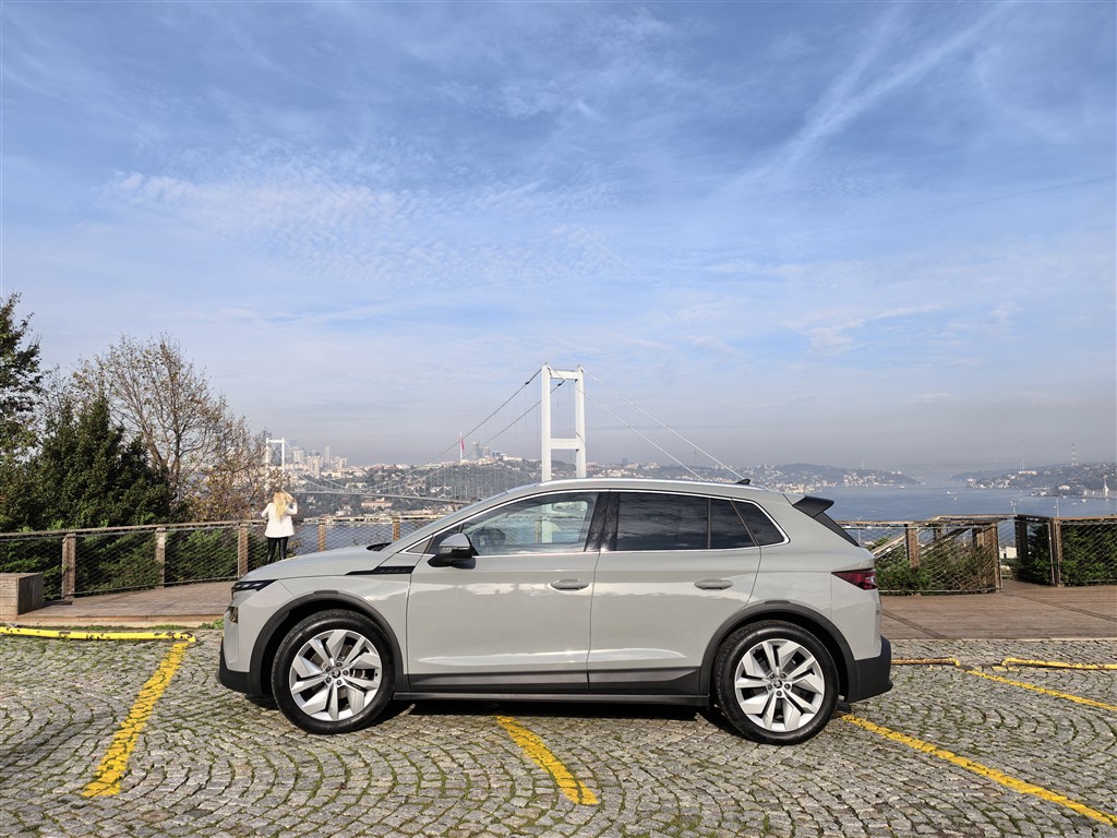 Elroq, Skoda’nın yeni “Modern Solid” tasarım dilinin en net temsilcilerinden biri. Önde ızgarasız yüz, bölünmüş farlar ve güçlü hatlar sayesinde araç Karoq’tan belirgin şekilde daha futuristik duruyor. Arka bölüm ise geniş stop grubu ve yatay çizgilerle ayakta oldukça dengeli görünüyor. Test ettiğimiz model 19 inç jantlarla geliyordu; görsel olarak etkileyici fakat sert amortisör ayarlarıyla birleştiğinde bozuk zeminlerde biraz titreşim hissediliyor.