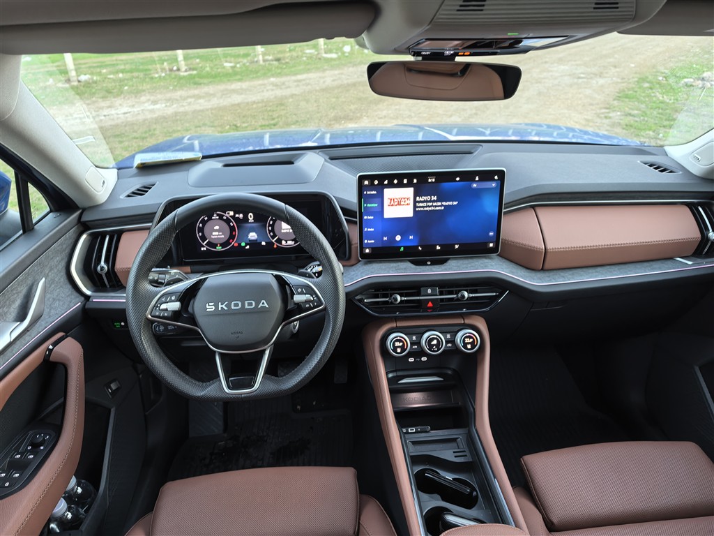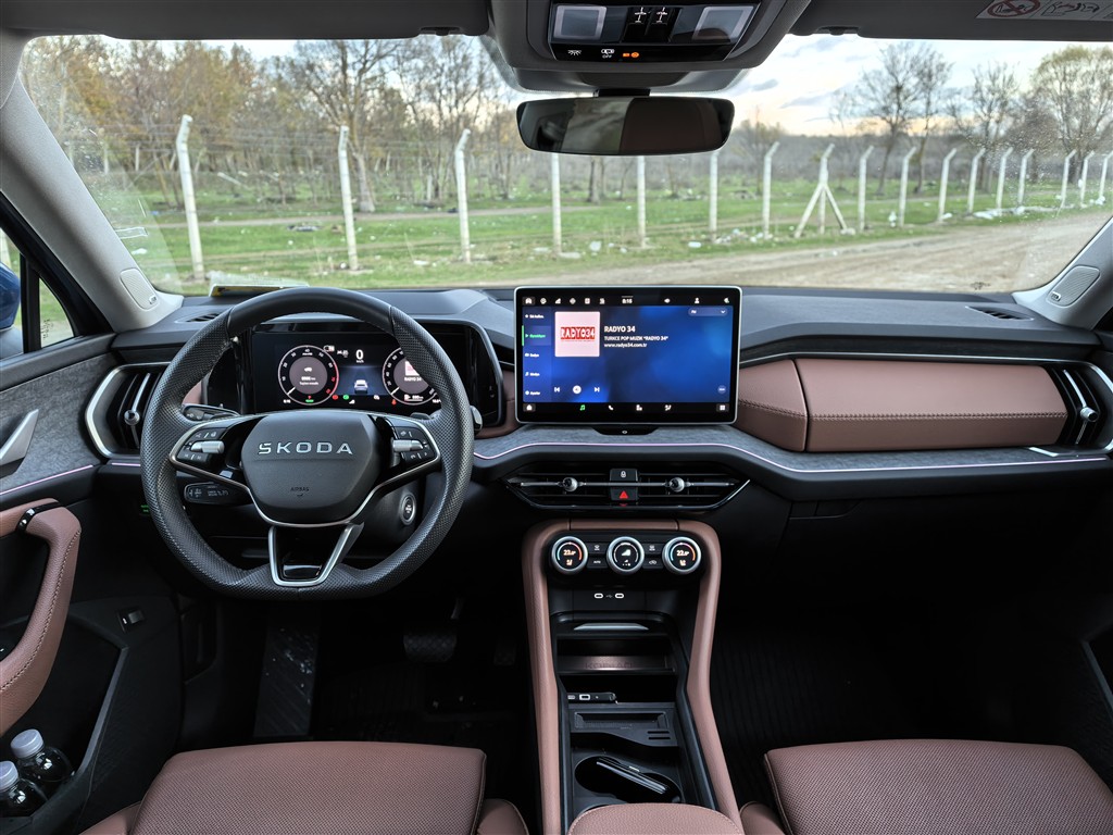 Orta konsoldaki yeni çoklu fonksiyonlu kumanda düğmeleri, büyük ekran ve düzenli kontrol alanları kullanım kolaylığı sağlıyor. Malzeme kalitesi belirgin şekilde iyileştirilmiş; yumuşak yüzeyler, dikiş detayları ve sade renk geçişleri premium hissi destekliyor. İster beş koltuklu ister yedi koltuklu versiyon olsun, Kodiaq sınıfında en geniş iç hacim sunan modellerden biri.